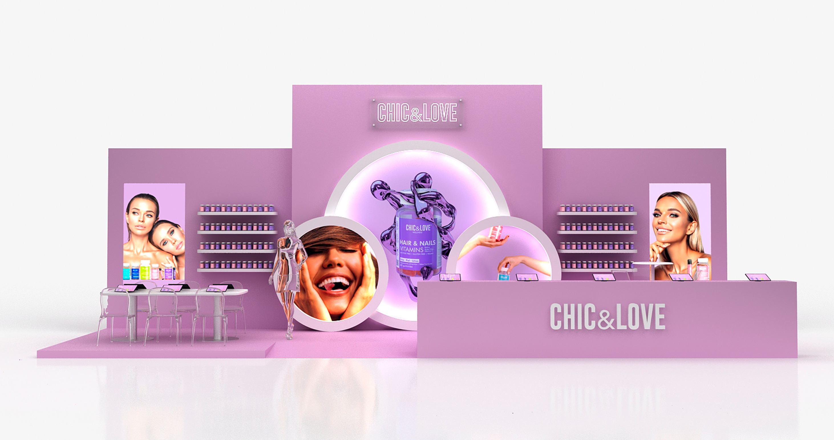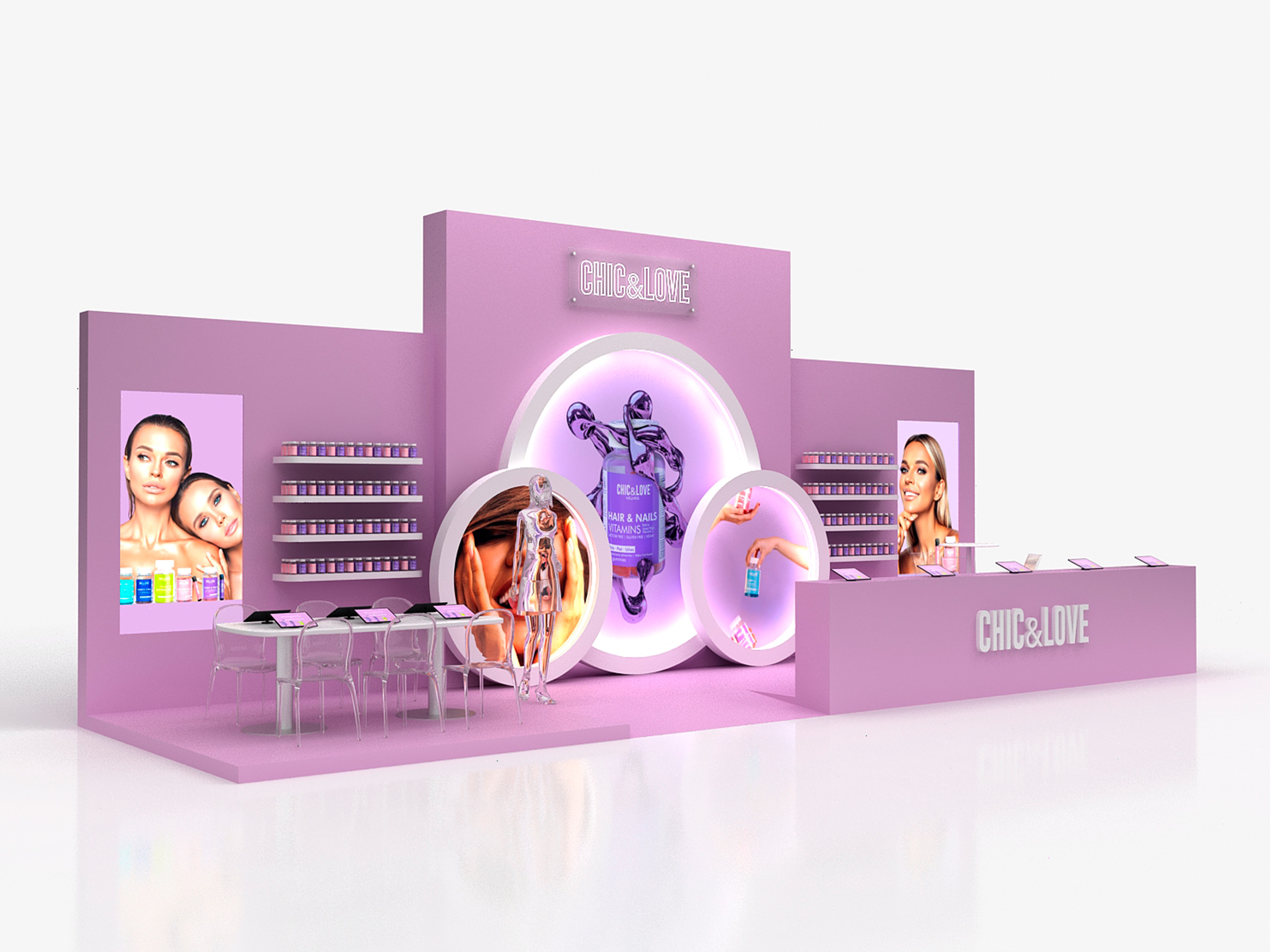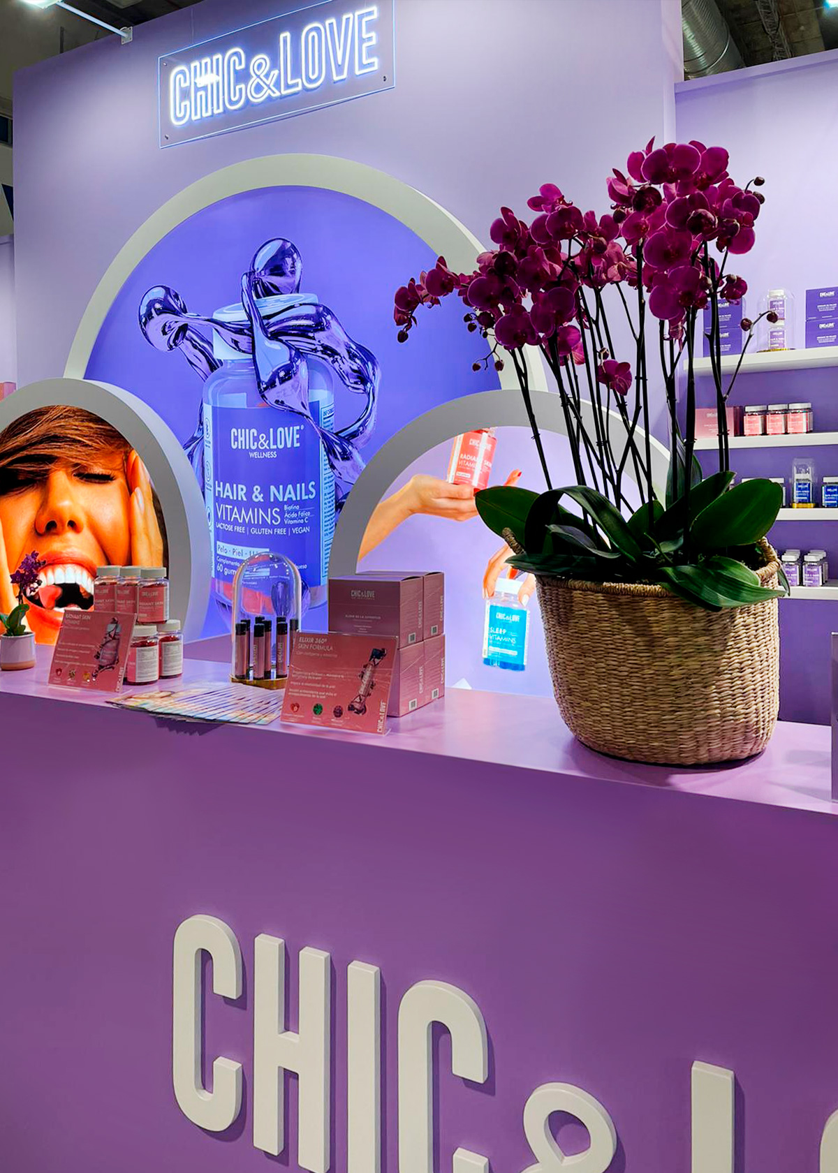 Este es nuestro último trabajo realizado para CHIC & LOVE en la feria Salon Look de Ifema, una marca especializada en el bienestar y cuidado personal, creada para ayudar a las personas a conseguir su mejor versión a través de productos que contribuyen al bienestar con un diseño único.
