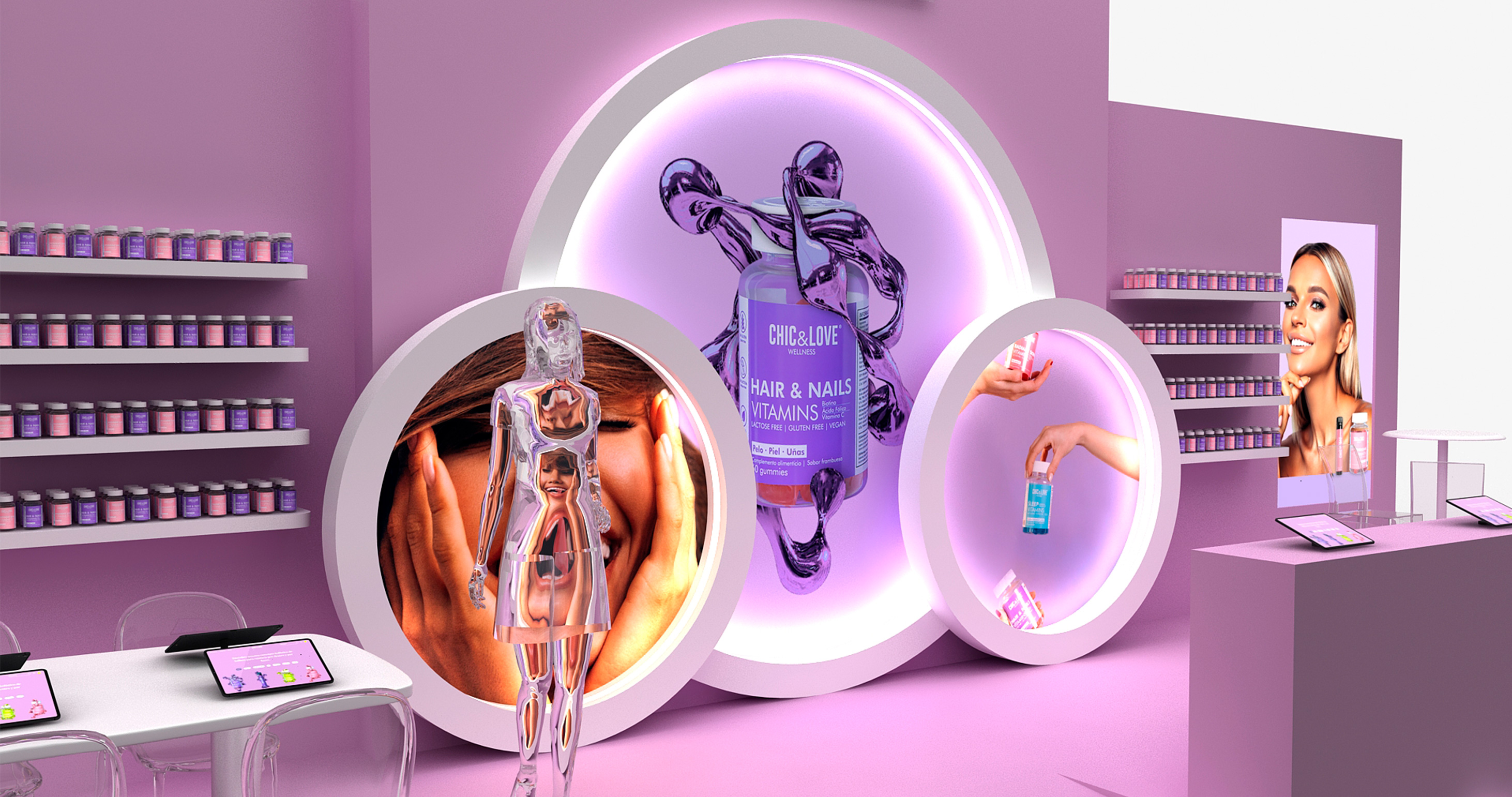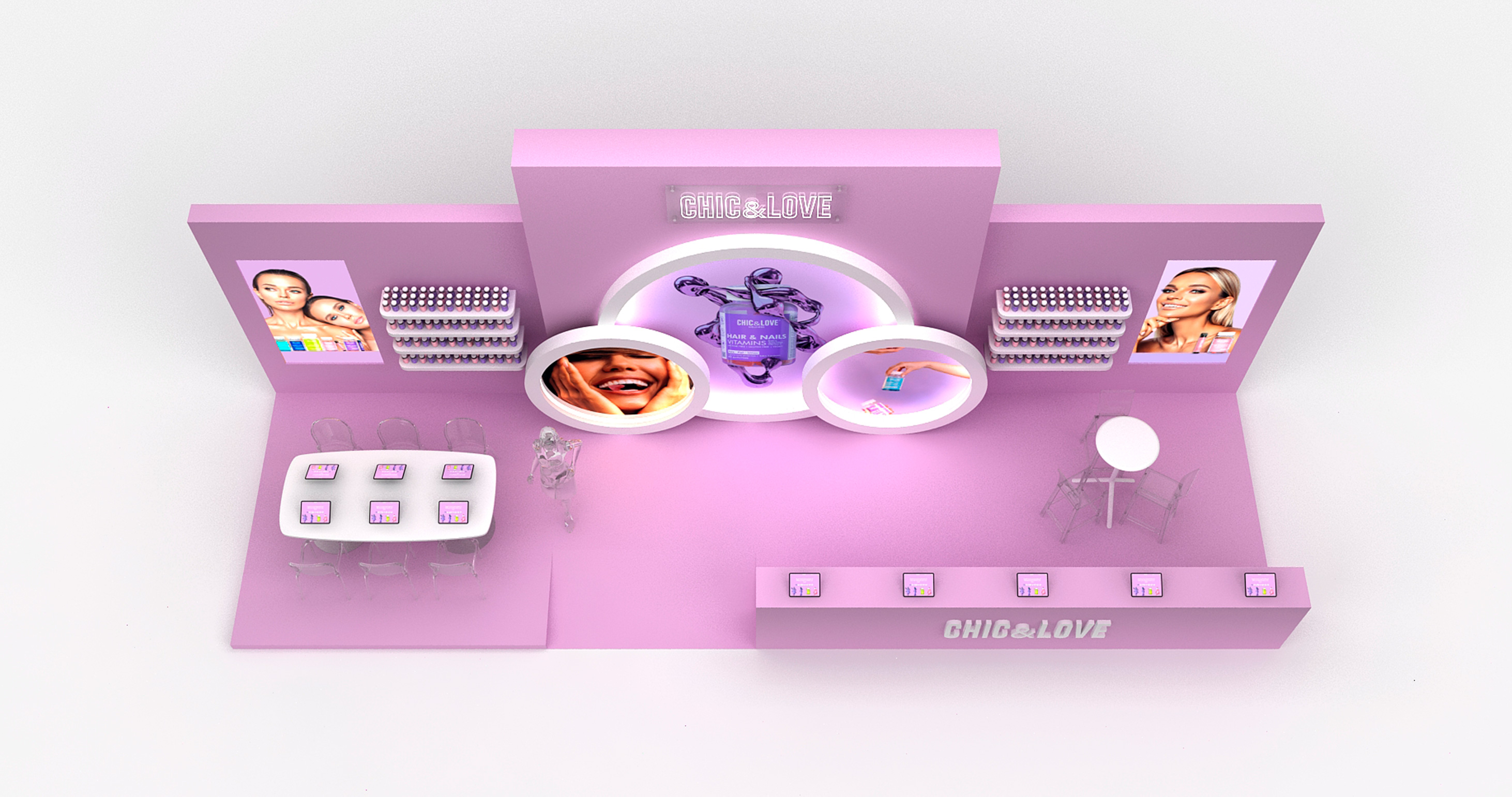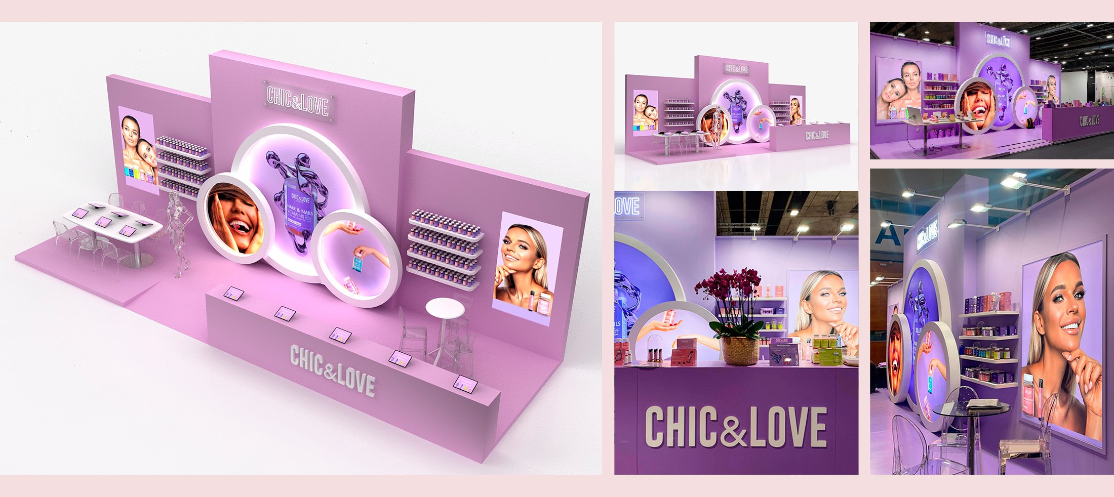 Este es nuestro último trabajo realizado para CHIC & LOVE en la feria Salon Look de Ifema, una marca especializada en el bienestar y cuidado personal, creada para ayudar a las personas a conseguir su mejor versión a través de productos que contribuyen al bienestar con un diseño único.
